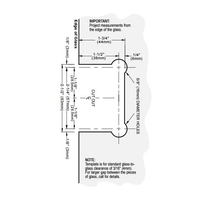 Glass to glass shower screen hinge set includes: gaskets, screws and glass fabrication dimensions.